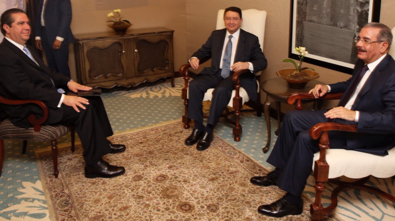 A la derecha, presidente de la República, Danilo Medina, junto aTaleb Rifai, secretario general de la Organización Mundial de Turismo (OMT) y el ministro de Turismo, Francisco Javier García, presentes durante el encuentro efectuado en el hotel El Embajador de esta ciudad, luego de la ceremonia de apertura.