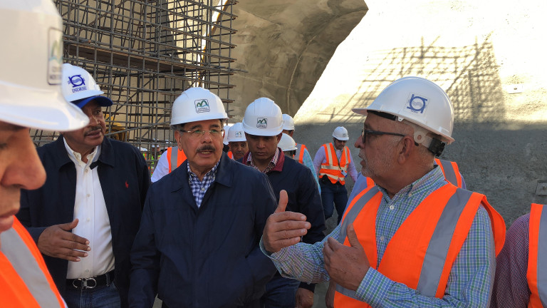 El presidente Danilo Medina durante su recorrido por la Presa Monte Grande, en Barahona, donde constató los avances en los túneles y recibió explicaciones de los detalles técnicos de la obra.