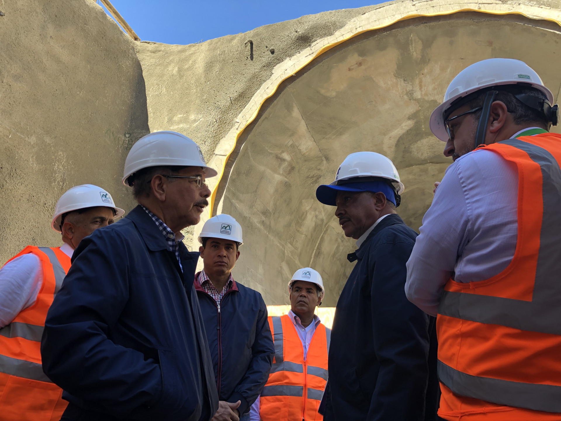 El presidente Danilo Medina durante su recorrido por la Presa Monte Grande, en Barahona, donde constató los avances en los túneles y recibió explicaciones de los detalles técnicos de la obra.