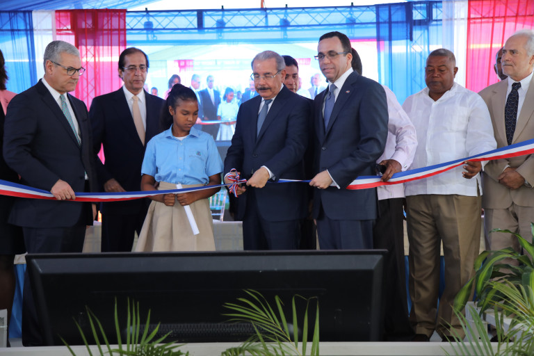 El presidente Danilo Medina corta la cinta para dejar aperturado de forma conjunta, tres centros educativos en beneficio de más de 1,680 estudiantes que ingresan a la Jornada Escolar Extendida en Barahona.