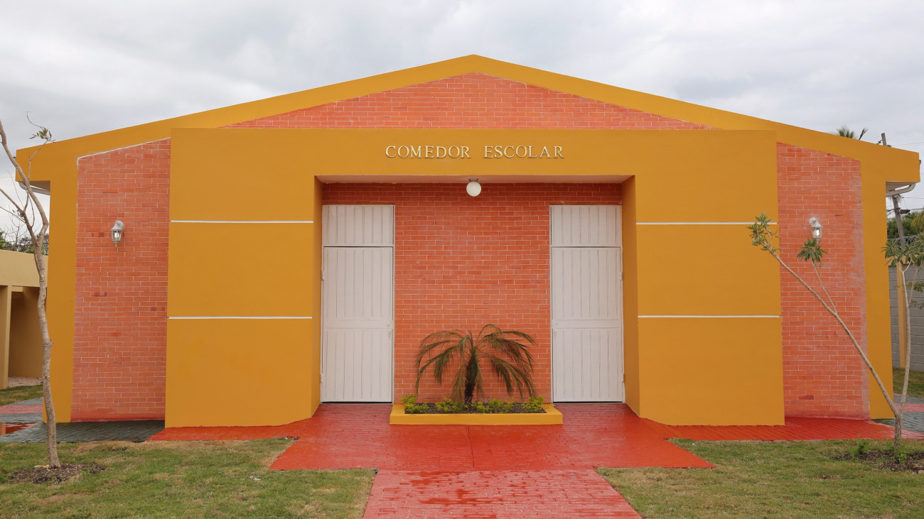 Parte frontal del comedor de una de las escuelas que el presidente Medina entregó en Boca Chica.