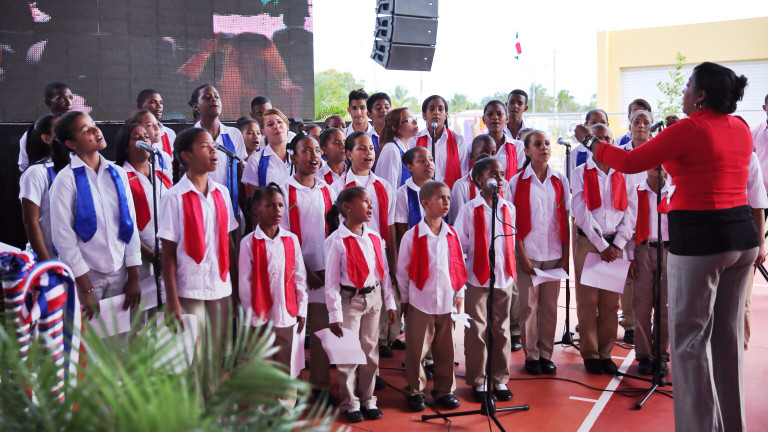 Participación de la agrupación coral Centro de Excelencia Dominicana mientras interpreta las notas del Himno Nacional.