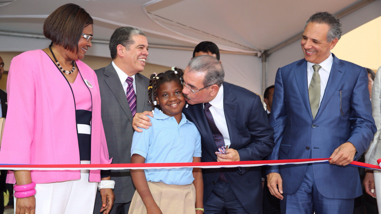 El presidente Medina procede a realizar el corte de cinta para dejar inaugurada la Escuela Andrés Avelino, la cual consta de 16 aulas para Tanda Extendida. Le acompañan, el ministro de Educación, Carlos Amarante Baret, el ministro Administrativo de la Presidencia, José Ramón Peralta, una alumna y directora del centro educativo inaugurado.