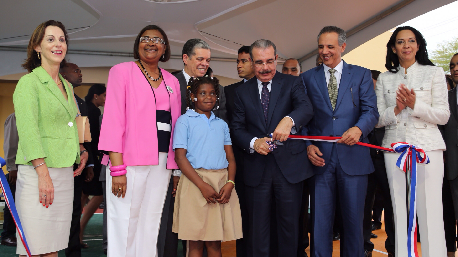 El presidente Medina realiza el corte de cinta que deja inaugurada la escuela Andrés Avelino, de 16 aulas, en el municipio de Andrés.