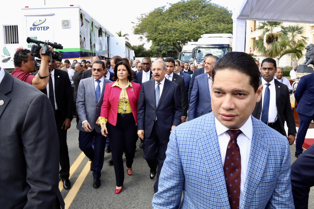 Recorrido del presidente Danilo Medina, junto a las demás autoridades presentes, por algunas de las unidades del Programa de Talleres Móviles, a cargo del INFOTEP.
