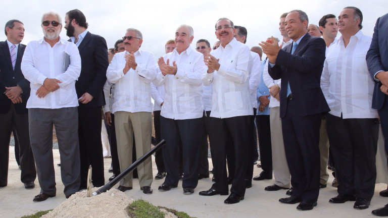 Participación del presidente Medina durante la recepción inaugural por los inicios de trabajos de la nueva obra. Figuran entre los presentes, los señores Arturo Santana, presidente de Propa-Gas y Coastal Dominicana Rolando González, presidente del Consejo de Directores de InterEnergy, Juan Vicini, representante de IPSON, Rubén Bichara, vicepresidente ejecutivo de la CDEEEE, entre otros funcionarios del Gobierno y ejecutivos de la empresa.