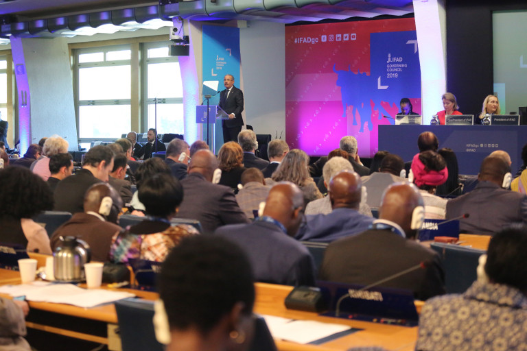 El presidente Danilo Medina durante su intervención ante el 42° período de sesiones del Consejo de Gobernadores del Fondo Internacional para el Desarrollo Agrícola (FIDA), en Roma, Italia.