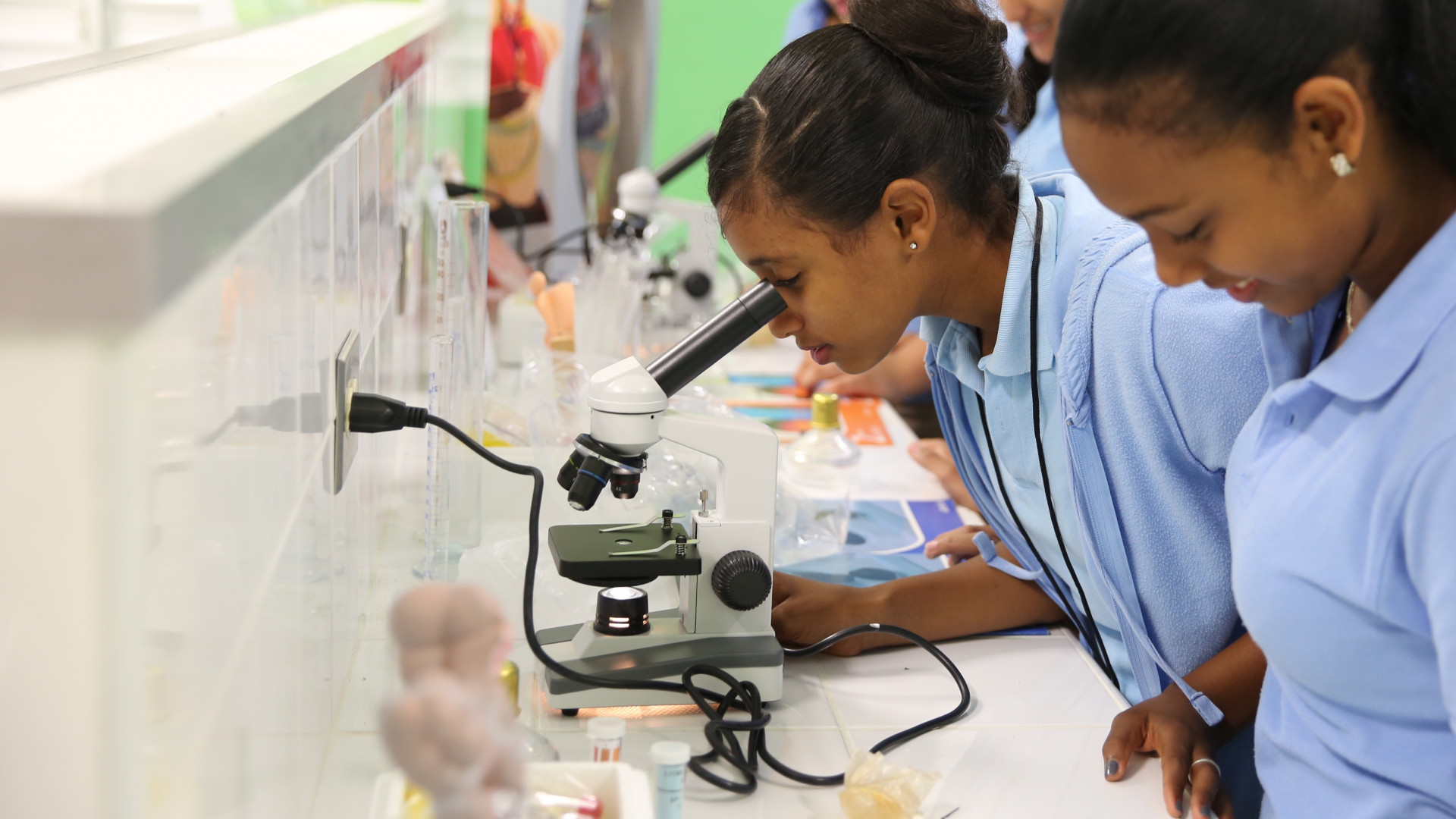 Alumnas en el laboratorio de uno de los cincos centros educativos de la provincia Duarte, inaugurados hoy por el presidente Danilo Medina.