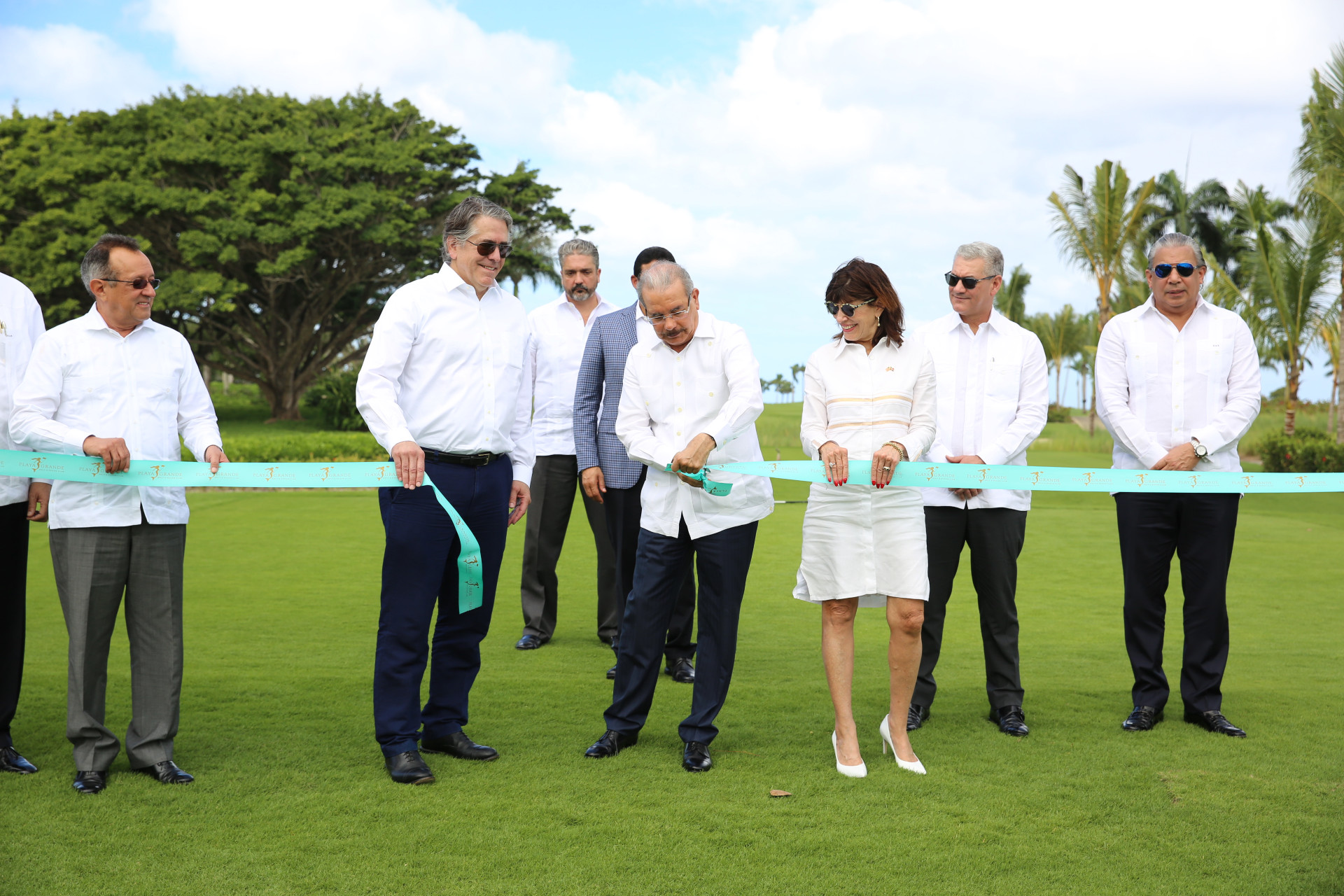 El presidente Danilo Medina junto ejecutivos de la empresa; la embajadora de Estados Unidos en el país, Robin S. Bernstein, y funcionarios del Gobierno, cortan la cinta para la puesta en funcionamiento de Playa Grande Golf & Ocean Club, en María Trinidad Sánchez.