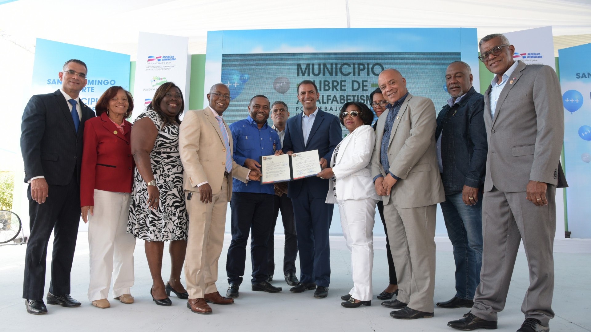 Participación de Domingo Contreras, director general de DIGEPEP y otras autoridades, durante entrega de la placa de reconocimiento de “Municipio Libre de Analfabetismo”, recibida por René Polanco Vidal, alcalde municipal de Santo Domingo Norte.