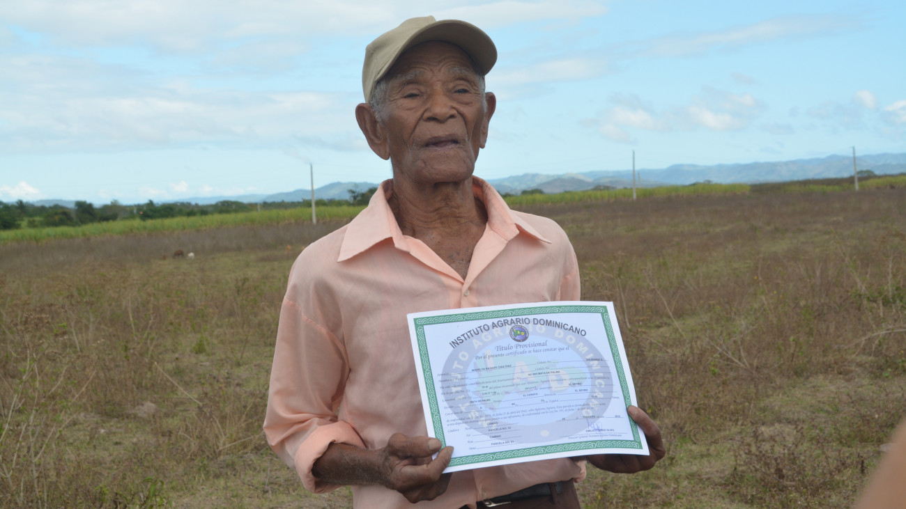 “Mi parcela la trabajaré yo con la fuerza que todavía tengo. Sembraré yuca, plátano y otros rubros. Contento, porque estoy vivo para gozar mi título y trabajar mi parcela”, dijo Catalino de la Cruz, productor con 108 años de edad, beneficiado con una parcela.