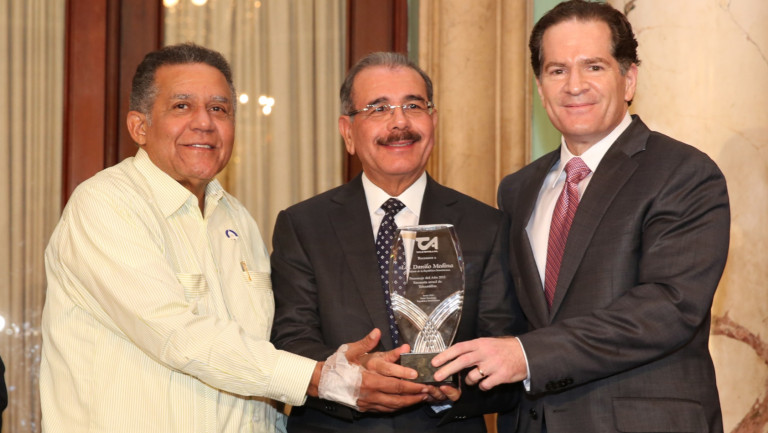 El presidente Danilo Medina recibe la placa de reconocimiento de manos de Manuel Corripio, presidente de Comunicaciones del Grupo Corripio y Juan Bolívar Díaz, director de prensa de Teleantillas.