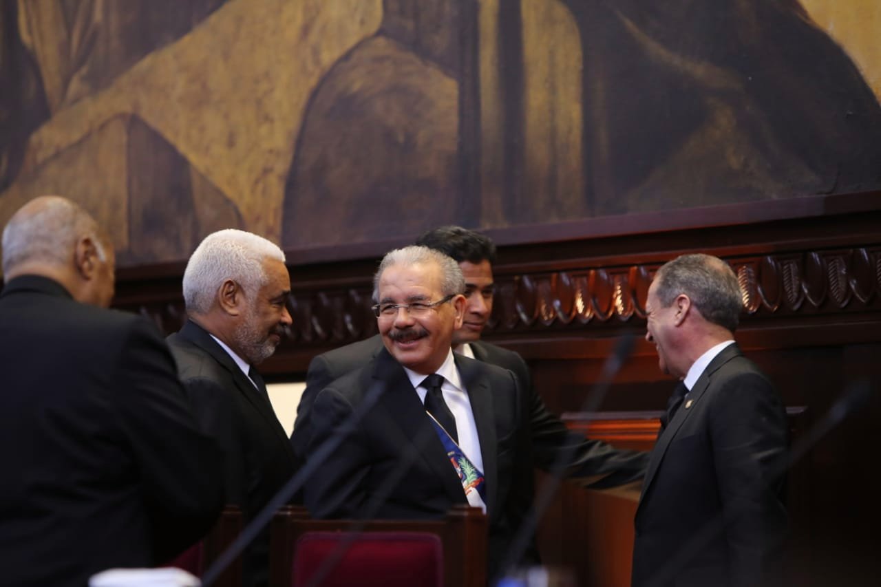 El presidente Danilo Medina saluda a los presentes a su llegada a la Sala de la Asamblea Nacional del Congreso, con ocasión del 175 aniversario de la Independencia Nacional.