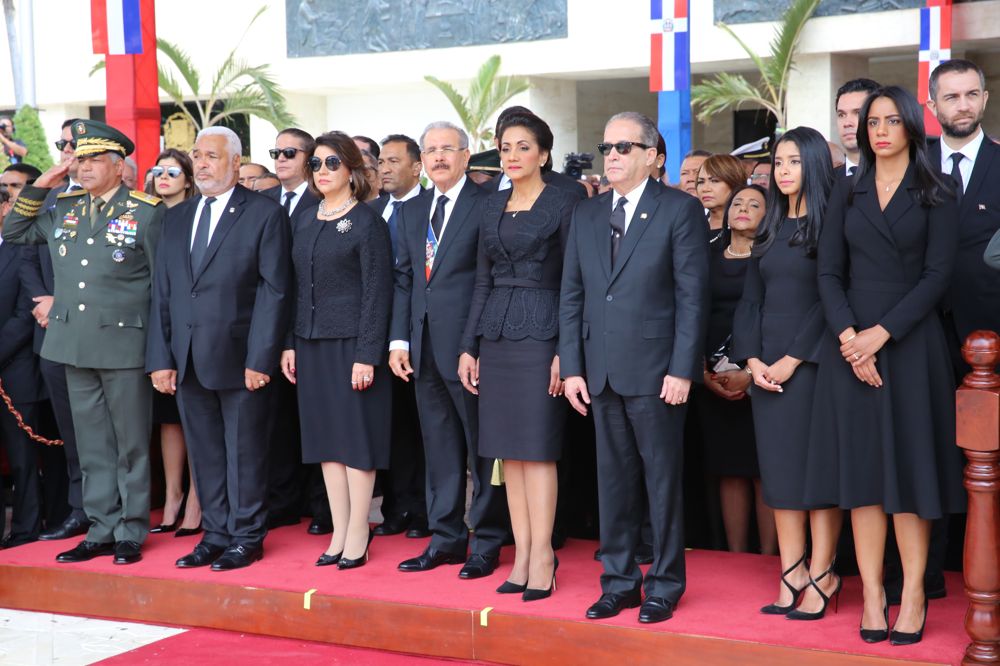 El presidente Danilo Medina y la vicepresidenta Margarita Cedeño de Fernández, al recibir los Honores Militares con salva de 21 cañonazos, en la explanada frontal del Congreso Nacional.