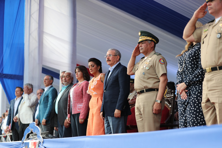 El presidente Danilo Medina acompañado de su esposa, Cándida Montilla de Medina; la vicepresidenta, Margarita Cedeño de Fernández; el ministro de Defensa, teniente general Rubén Darío Paulino Sem; altos mandos militares y policiales, y funcionarios del gabinete gubernamental.