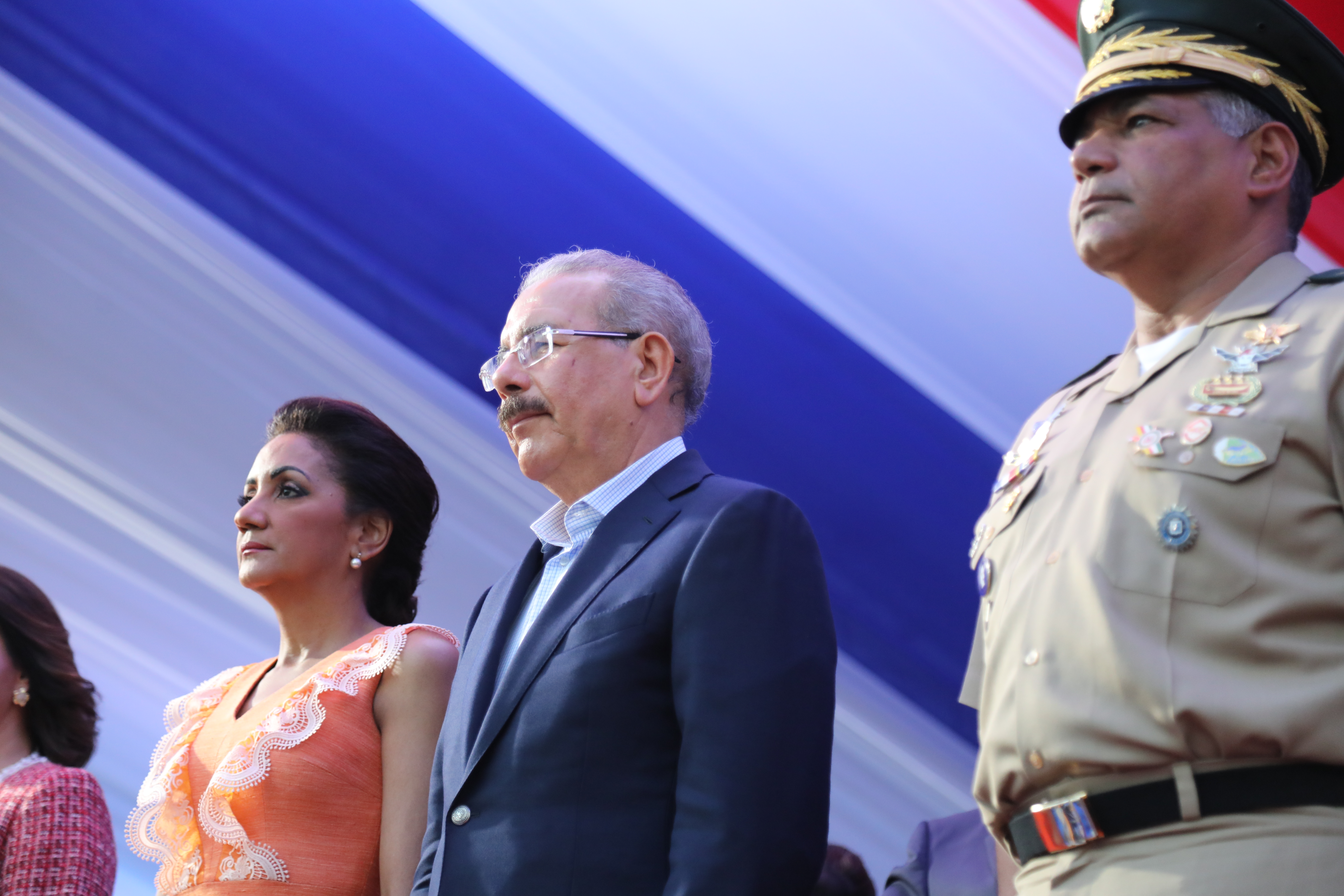 El presidente Danilo Medina acompañado de su esposa, Cándida Montilla de Medina; la vicepresidenta, Margarita Cedeño de Fernández; el ministro de Defensa, teniente general Rubén Darío Paulino Sem; altos mandos militares y policiales, y funcionarios del gabinete gubernamental.