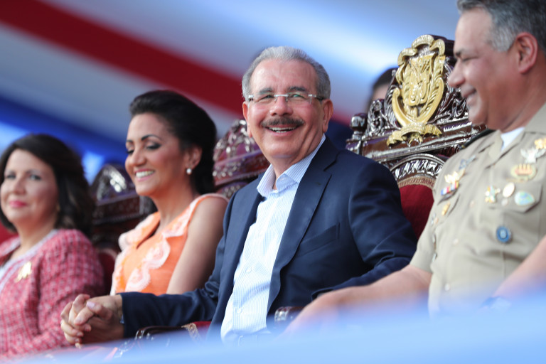 El presidente Danilo Medina acompañado de su esposa, Cándida Montilla de Medina; la vicepresidenta, Margarita Cedeño de Fernández; el ministro de Defensa, teniente general Rubén Darío Paulino Sem; altos mandos militares y policiales, y funcionarios del gabinete gubernamental.