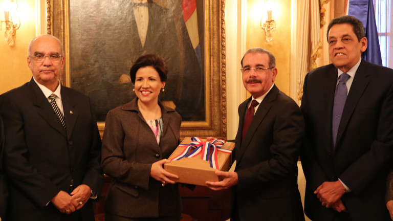 La vicepresidenta Margarita Cedeño de Fernandez hizo entrega al presidente Danilo Medina, del ante proyecto de ley junto a los integrantes de la comisión redactora del código, los magistrados Víctor José Castellanos, coordinador, Francisco Pérez Lora y los doctores Carmen Reyes Vargas, Milagros Pichardo, Yildalina Tatén, Tilza Ares, Ángel Cano y Altagracia Suriel. Figura el doctor César Pina Toribio, consultor jurídico del Poder Ejecutivo.