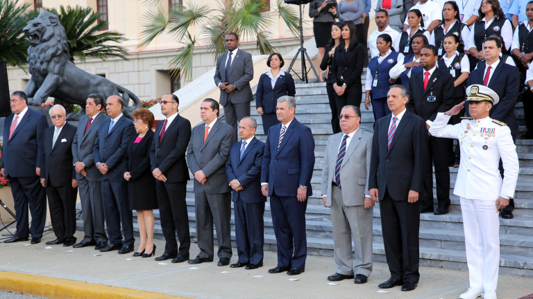 Ministros del gobierno y empleados del Palacio Nacional apostados en la explanada frontal, durante el acto de homenaje a la Bandera Dominicana, que encabezó el presidente Medina.