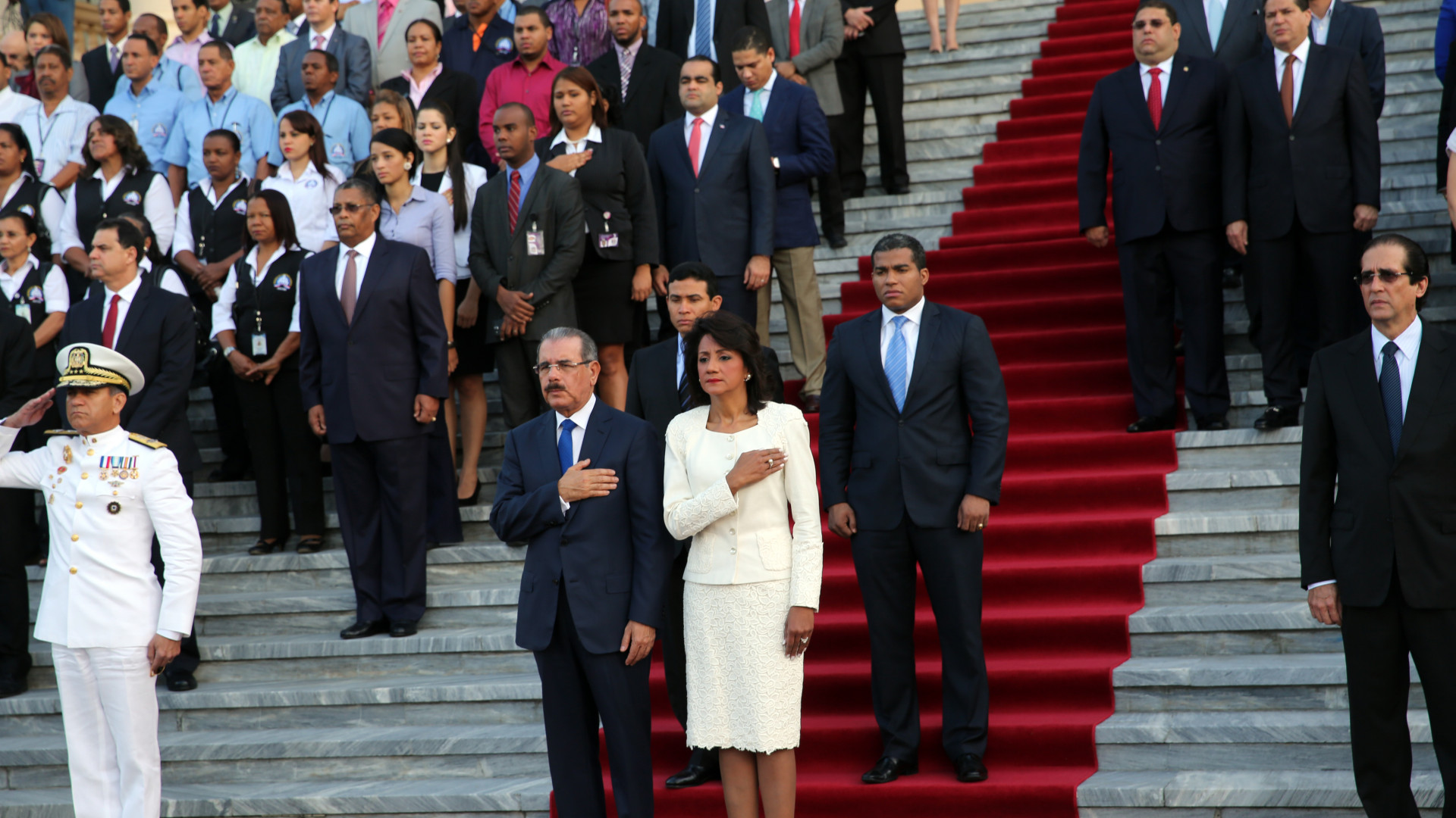 El presidente Danilo Medina, la primera dama, Cándida Montilla de Medina y los ministros del Gobierno, encabezan la ceremonia donde se rindió un solemne tributo a la Bandera Dominicana, durante un acto realizado en la explanada frontal del Palacio Nacional.