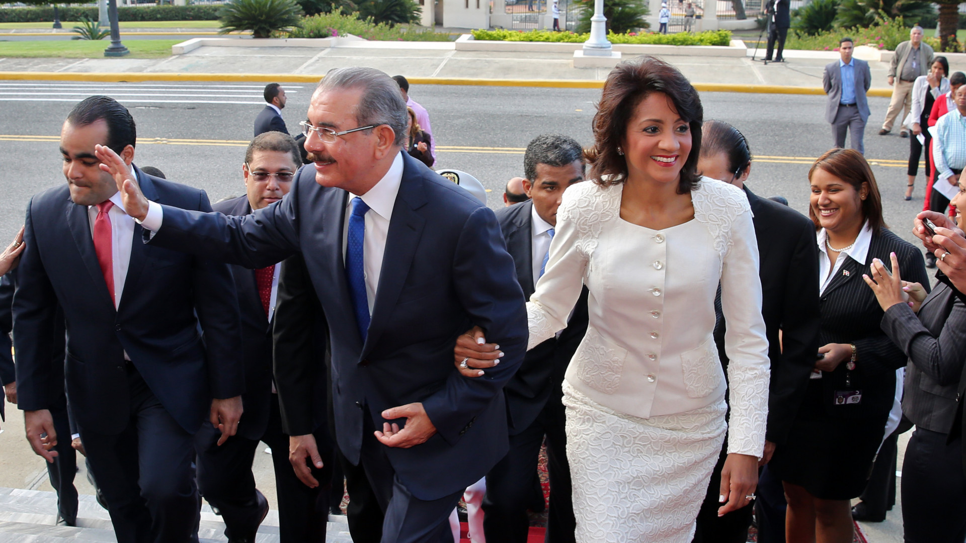 El presidente Danilo Medina junto a su señora, la primera dama, Candida Montilla de Medina, sube las escalinatas del Palacio Nacional para retornar a su despacho, luego de haber encabezdo el acto de homenaje a la Bandera.