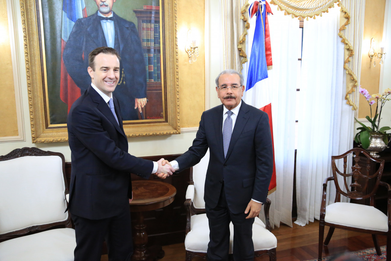 El presidente Danilo Medina y el vicepresidente senior de JetBlue, Ian Deason, durante su visita de cortesía, en el despacho presidencial del Palacio Nacional.
