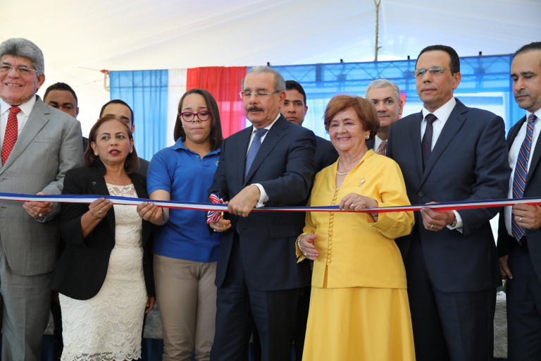 El presidente Danilo Medina corta la cinta para dejar inaugurado los nuevos centros de estudios. Le acompañan, la maestra y poetisa, Elsa Brito de Domínguez; y el ministro de Educación, Antonio Peña Mirabal, entre otras personalidades.