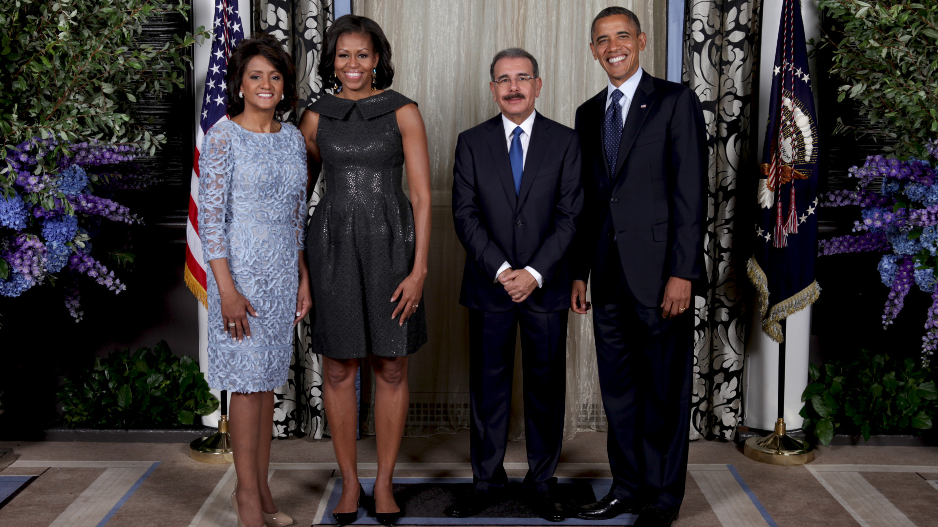 Presidente Danilo Medina y Cándida Montilla de Medina, esposa del mandatario, son recibidos por sus homólogos estadounidenses Barack y Michelle Obama. La fotografía se produjo durante la recepción ofrecida por el presidente Obama a los jefes de Estado y de Gobierno que participaron en la Asamblea General de las Naciones Unidas en Nueva York el 24 de septiembre del 2012.