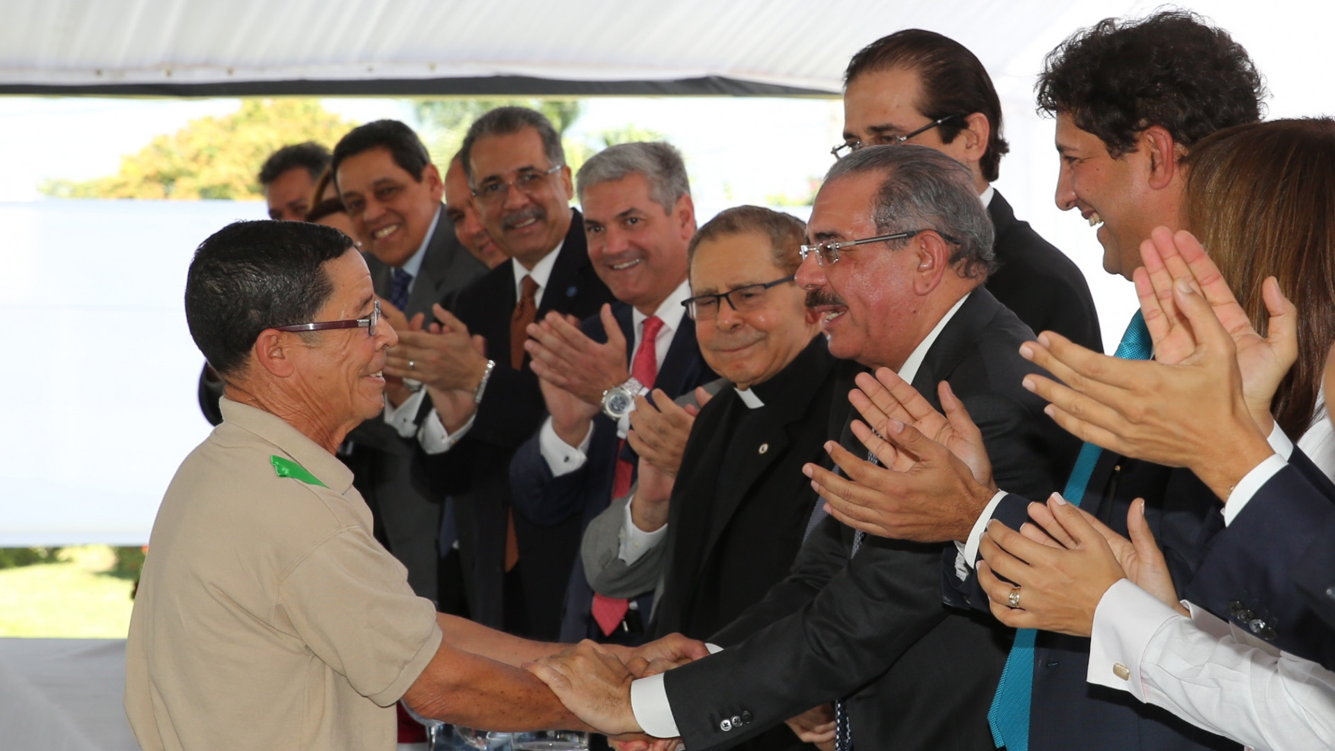 Leonardo Luciano, es felicitado por el presidente Danilo Medina, luego de haber pronunciado sus palabras y haber leído la carta de motivación del Presidente a quienes se esfuerzan por aprender a leer y escribir.