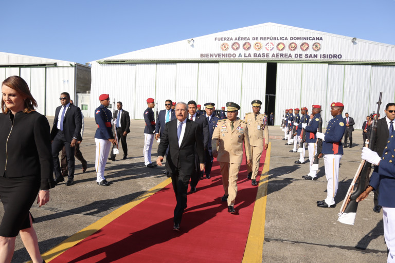 El presidente Danilo Medina acompañado del ministro de Defensa Teniente General (ERD), Rubén Darío Paulino Sem, quien acudió a despedirlo a su salida por la Base Aérea de San Isidro.