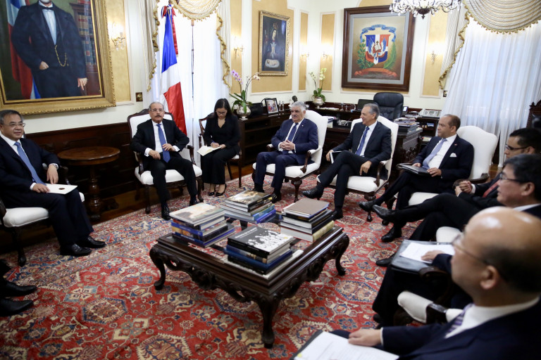 Durante el encuentro, Danilo Medina estuvo acompañado de Miguel Vargas Maldonado, ministro de Relaciones Exteriores; José Ramón Peralta, ministro administrativo de la Presidencia, y Briunny Garabito Segura, embajador dominicano en la República Popular China.