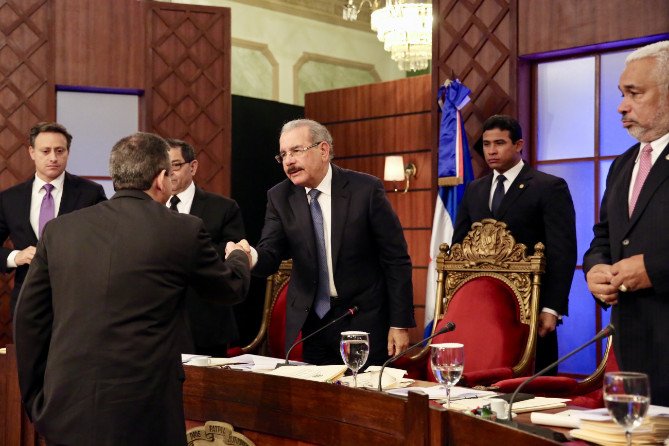 Consejo Nacional de la Magistratura (CNM), encabezado por el presidente Danilo Medina en calidad de presidente del CNM, durante las evaluaciones realizadas hoy en el Salón Verde del Palacio Nacional.