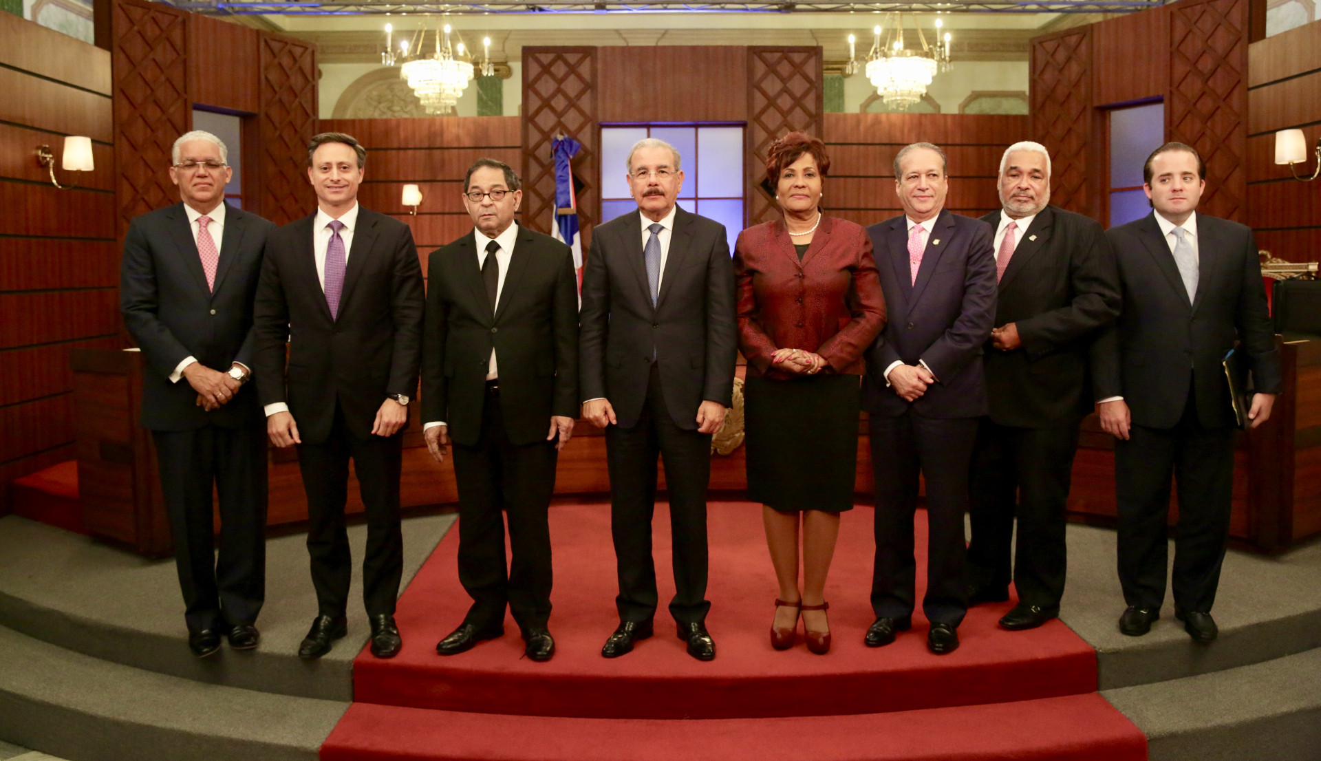 El presidente de la República, Danilo Medina, quien encabeza el CNM, junto a los consejeros Mariano Germán Mejía, presidente de la SCJ; Reinaldo Pared Pérez, presidente del Senado; Jean Alain Rodríguez, procurador general de la República; Radhamés Camacho, presidente de la Cámara de Diputados; senador José Paliza, diputada Josefa Castillo, y Fran Soto, juez de la SCJ y secretario del CNM.
