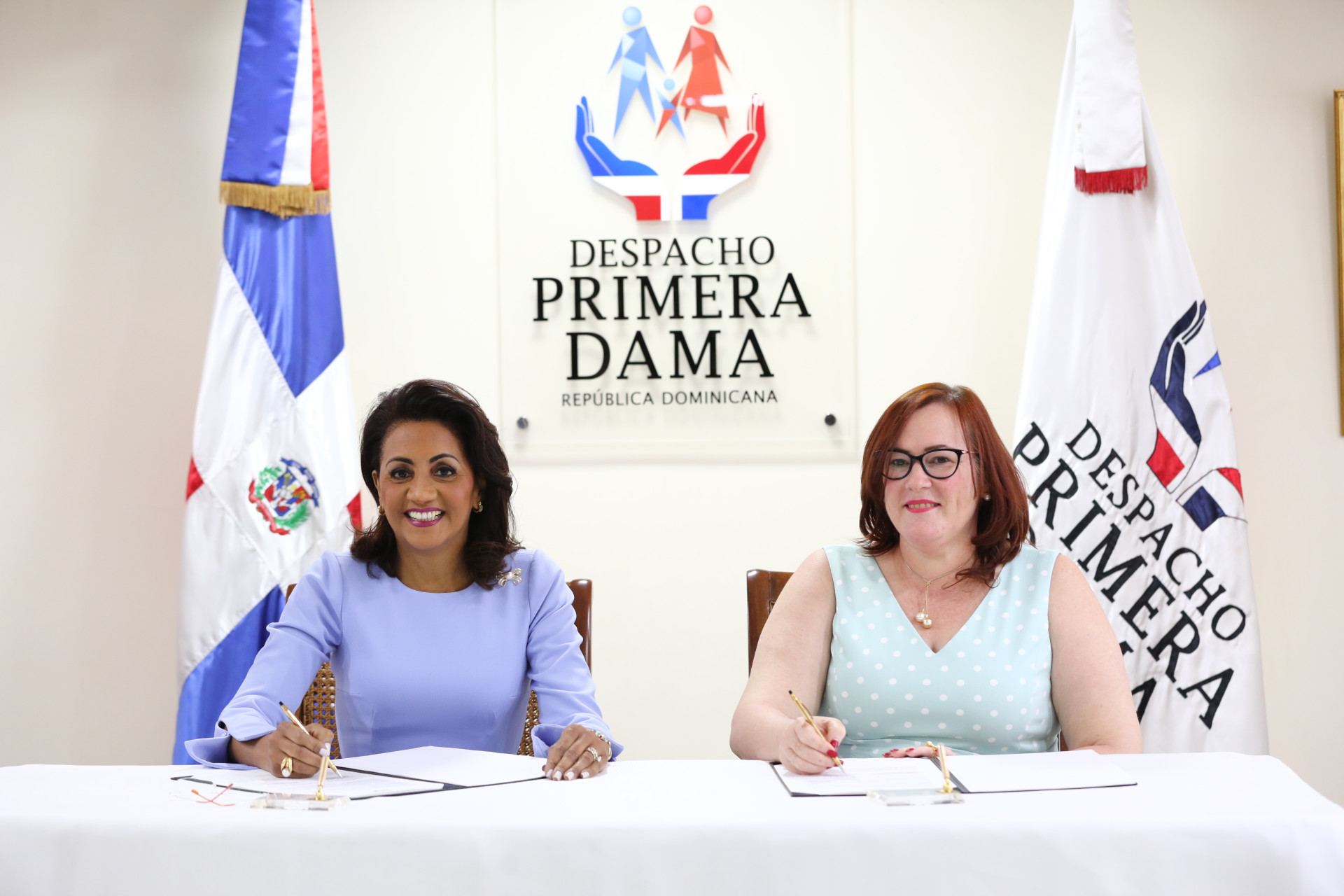 La primera dama de la República, Cándida Montilla de Medina y la ministra de la Mujer, Janet Camilo, en representación de sus respectivas instituciones, durante el acto de firmas.