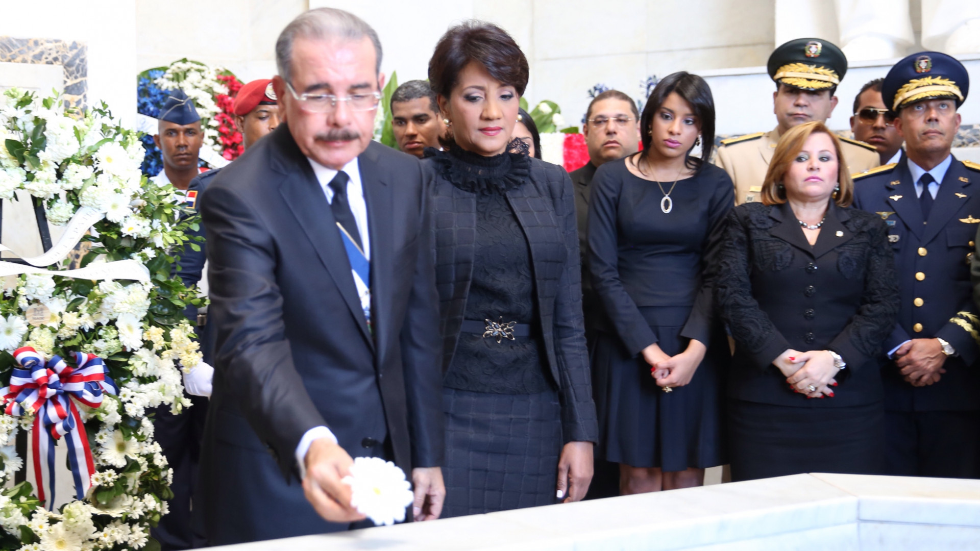 El presidente Danilo Medina, junto a su esposa, Cándida Montilla de Medina, deposita una flor en el mausoleo del Altar de la Patria, donde descansan los restos de los Padres de la Patria: Juan Pablo Duarte, Matías Ramón Mella y Francisco del Rosario Sánchez, luego de su discurso de rendición de cuentas ante la Asamblea Nacional y de participar en el Tedeum en la Catedral Primada de América el 27 de febrero de 2014.