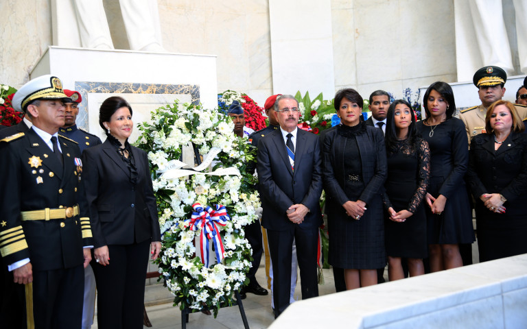 El presidente Danilo Medina, acompañado de la vicepresidenta Margarita Cedeño de Fernández; la primera dama Cándida Montilla de Medina, e hijas Sibelys,y Ana Paula; autoridades civiles y militares, mientras depositan una ofrenda floral ante el mausoleo de los Padres de la Patria: Juan Pablo Duarte, Matías Ramón Mella y Francisco del Rosario Sánchez, por el 170 aniversario de la Independencia Nacional.