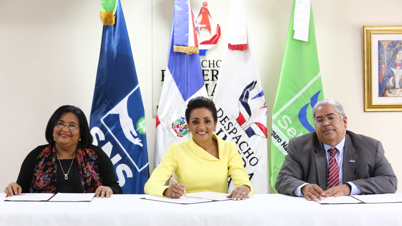 La directora ejecutiva del SeNaSa, Mercedes Rodríguez Silver; la primera dama, Cándida Montilla de Medina; y el director general SNS, Chanel Mateo Rosa Chupany.