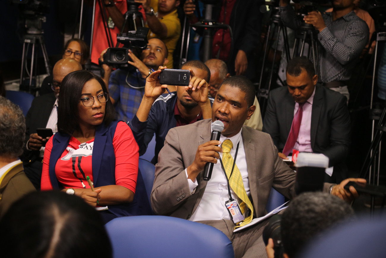 Periodistas presentes durante rueda de prensa realizada hoy en el Salón Orlando Martínez del Palacio Nacional.