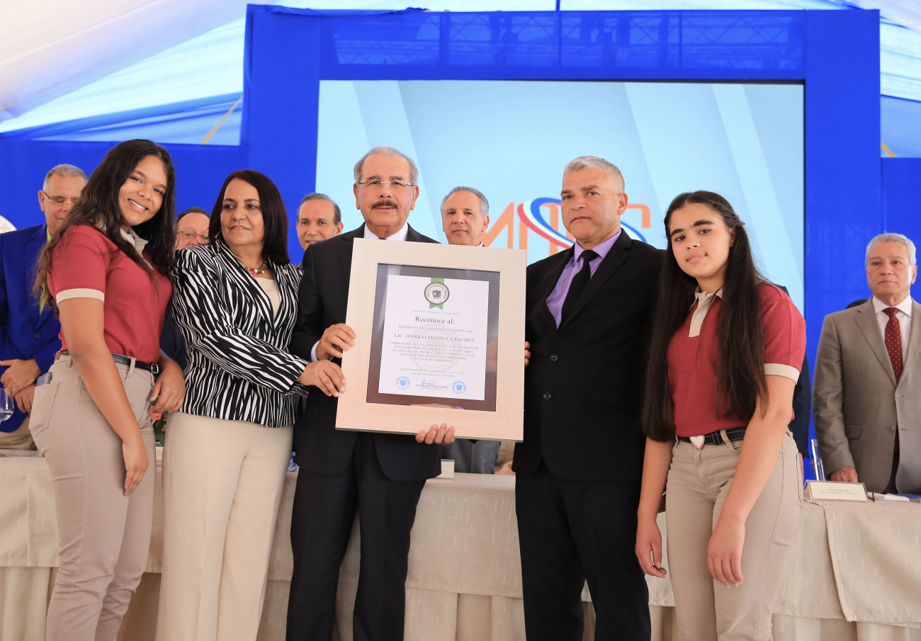El director distrital de Manabao, Anyelino Fernández, junto a las estudiantes Anabel Sánchez y Loanny Solares, entregaron una placa al jefe del Estado, donde lo reconocieron como padre del desarrollo de este distrito por los aportes a los sectores de educación, agrícola y turismo.