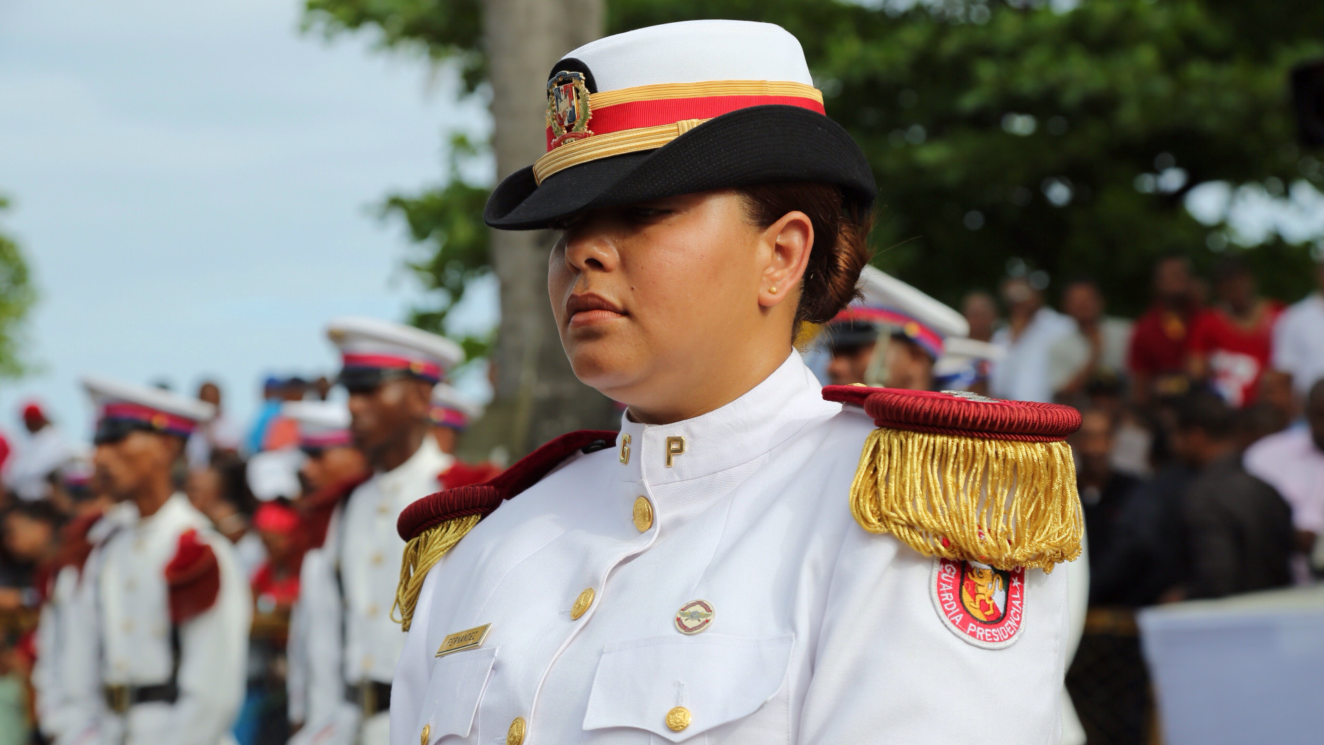 Integrante del Primer Regimiento Dominicano de la Guardia Presidencial, comandado por el General de Brigada, Braulio Alcántara López, durante el inicio del desfile militar efectuado en ocasión del 170 Aniversario de la Independencia Nacional, y celebrado en la avenida George Washington (Malecón) de Santo Domingo.