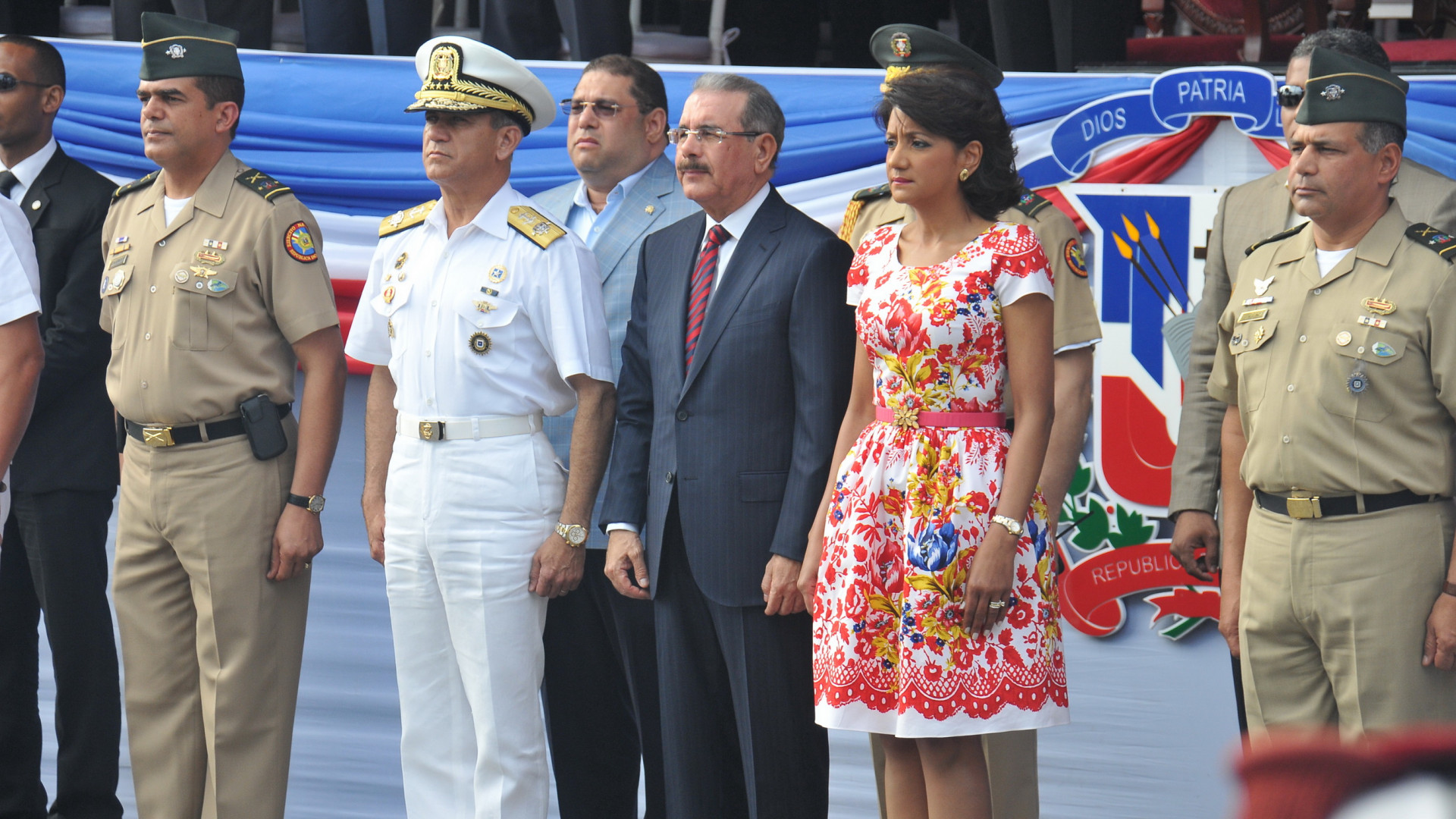 El presidente Danilo Medina, su esposa, Cándida Montilla de Medina, el ministro de las Fuerzas Armadas, almirante Sigfrido Pared Pérez, junto a principales autoridades civiles y castrenses, recibe los honores de estilo a su investidura previo al desfile militar en conmemoración del 170 aniversario de la Independencia Nacional, celebrado en la avenida George Washington (Malecón) de Santo Domingo.