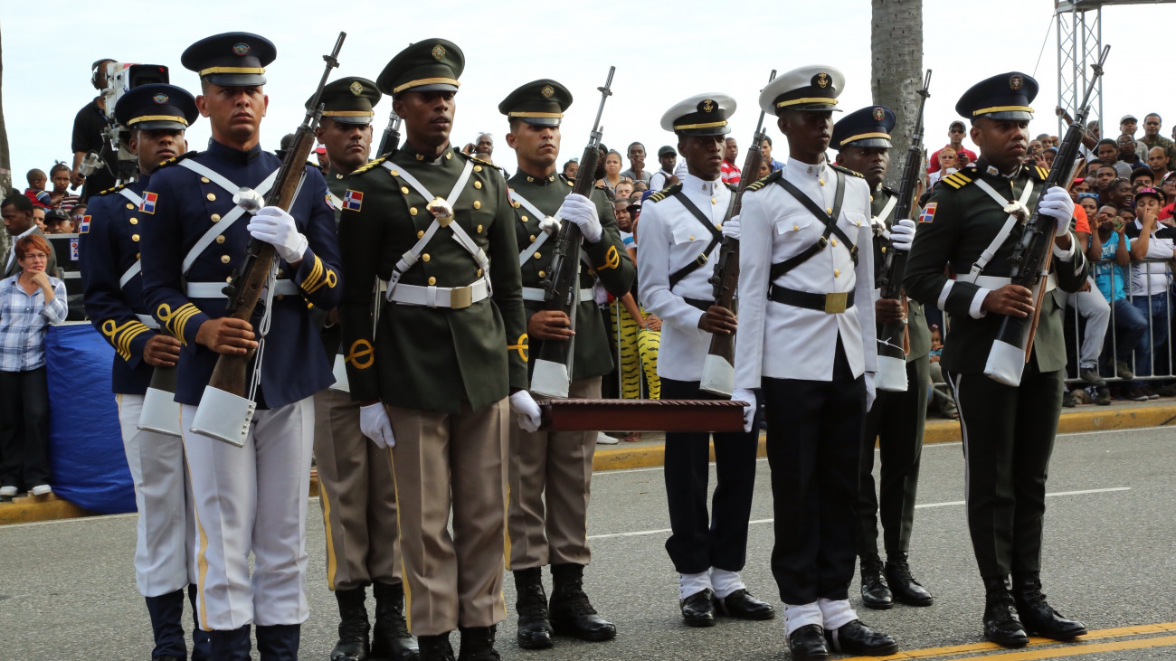 Grupo mixto de cadetes de los cuerpos castrenses, portadores del trabuco histórico que utilizó el patricio Matías Ramón Mella en la Puerta de la Misericordia, para anunciar a los dominicanos y al mundo la Independencia Nacional.