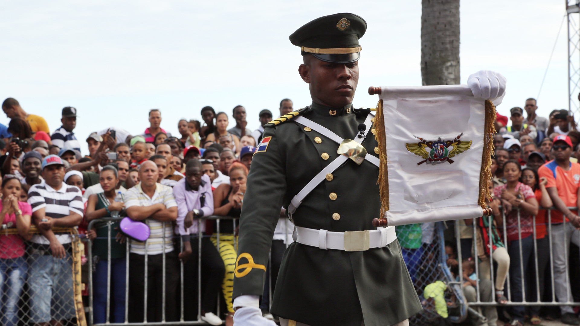 El cadete de cuarto año del Ejército Nacional Juan Encarnación Gómez da lectura a la Orden del Día ante el presidente Danilo Medina durante el desfile militar en conmemoración del 170 aniversario de la Independencia Nacional, celebrado en la avenida George Washington (Malecón) de Santo Domingo.