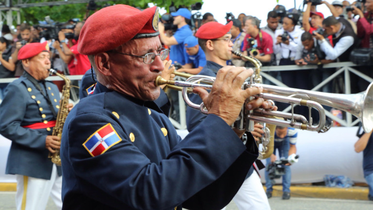 Integrantes de la Banda de Música de la Defensa Nacional, presentes durante el desfile militar realizado en honor al presidente de la República, Danilo Medina Sánchez, por el Ministerio de Defensa y la Policía Nacional, con motivo del 170 aniversario de la Independencia Nacional