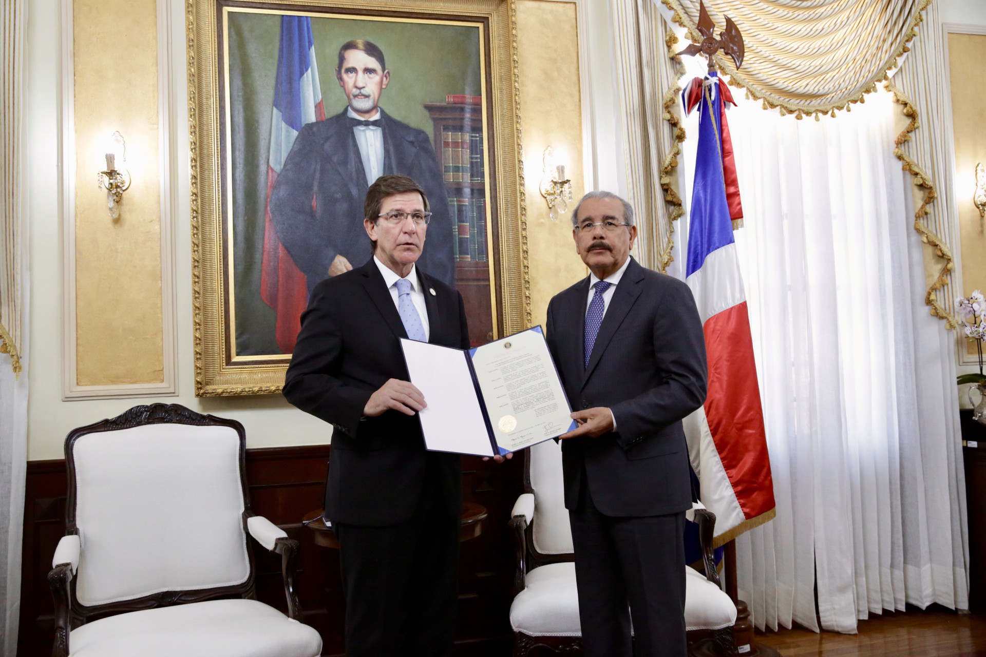 Durante el encuentro, que tuvo lugar en el despacho presidencial del Palacio Nacional, en representación del gobernador de Puerto Rico, Ricardo Roselló, Luis G. Rivera Marín entregó a Danilo Medina un pergamino de agradecimiento por la solidaria asistencia humanitaria de la República Dominicana, pueblo y gobierno, ante el fenómeno que afectó a la isla hermana, en septiembre de 2017.
