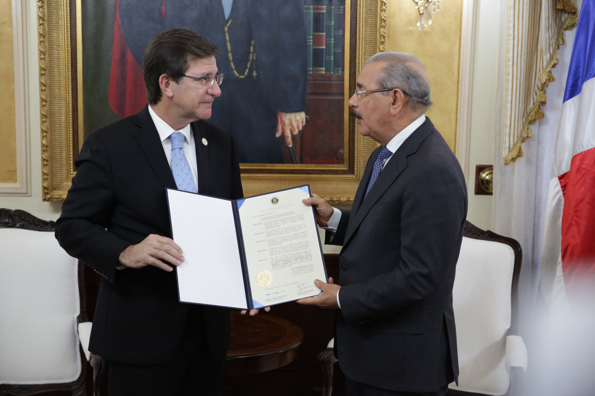 Durante el encuentro, que tuvo lugar en el despacho presidencial del Palacio Nacional, en representación del gobernador de Puerto Rico, Ricardo Roselló, Luis G. Rivera Marín entregó a Danilo Medina un pergamino de agradecimiento por la solidaria asistencia humanitaria de la República Dominicana, pueblo y gobierno, ante el fenómeno que afectó a la isla hermana, en septiembre de 2017