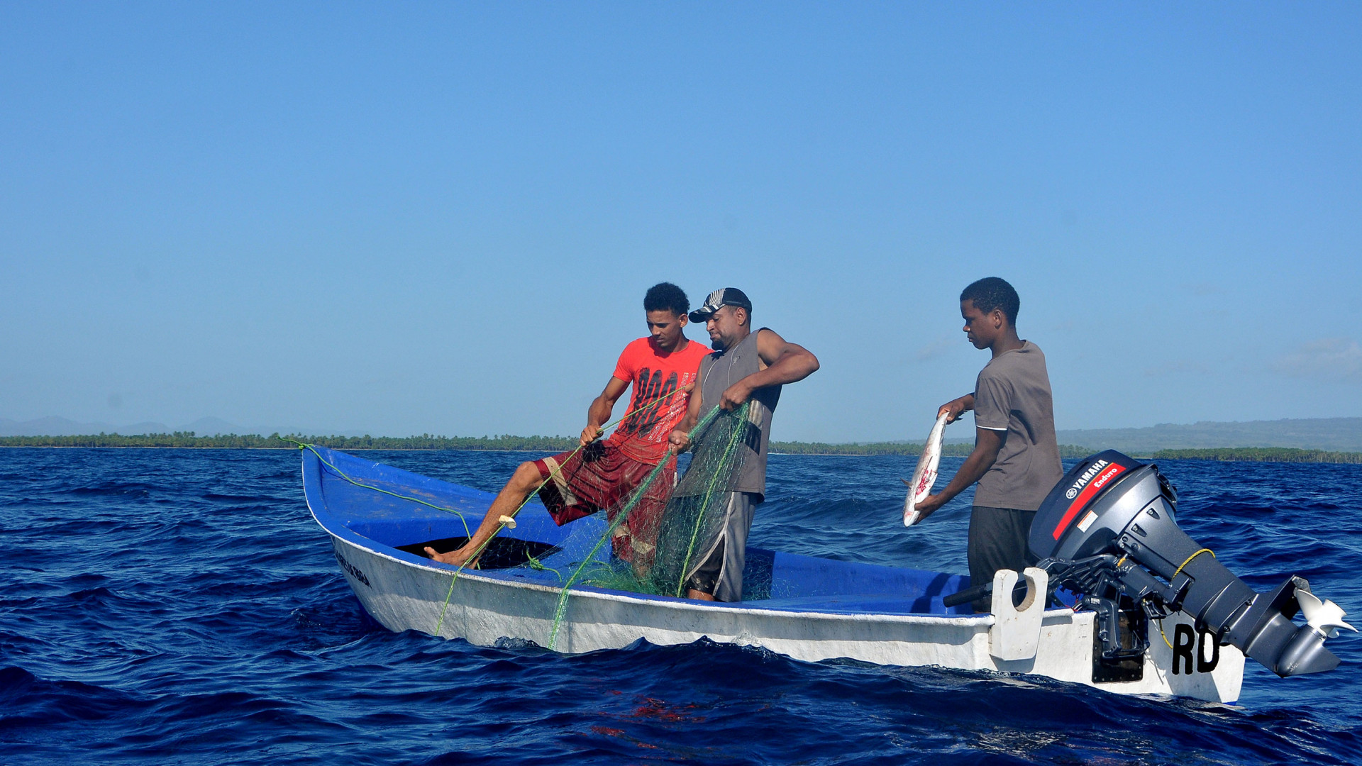 Integrantes de la asociación de pescadores (ASOPESCA), de la provincia María Trinidad Sánchez, Nagua, durante sus labores de pesca con equipos obtenidos mediante un financiamiento por RD$4.1 millones de pesos, aprobados en la pasada visita sorpresa del presidente Medina.