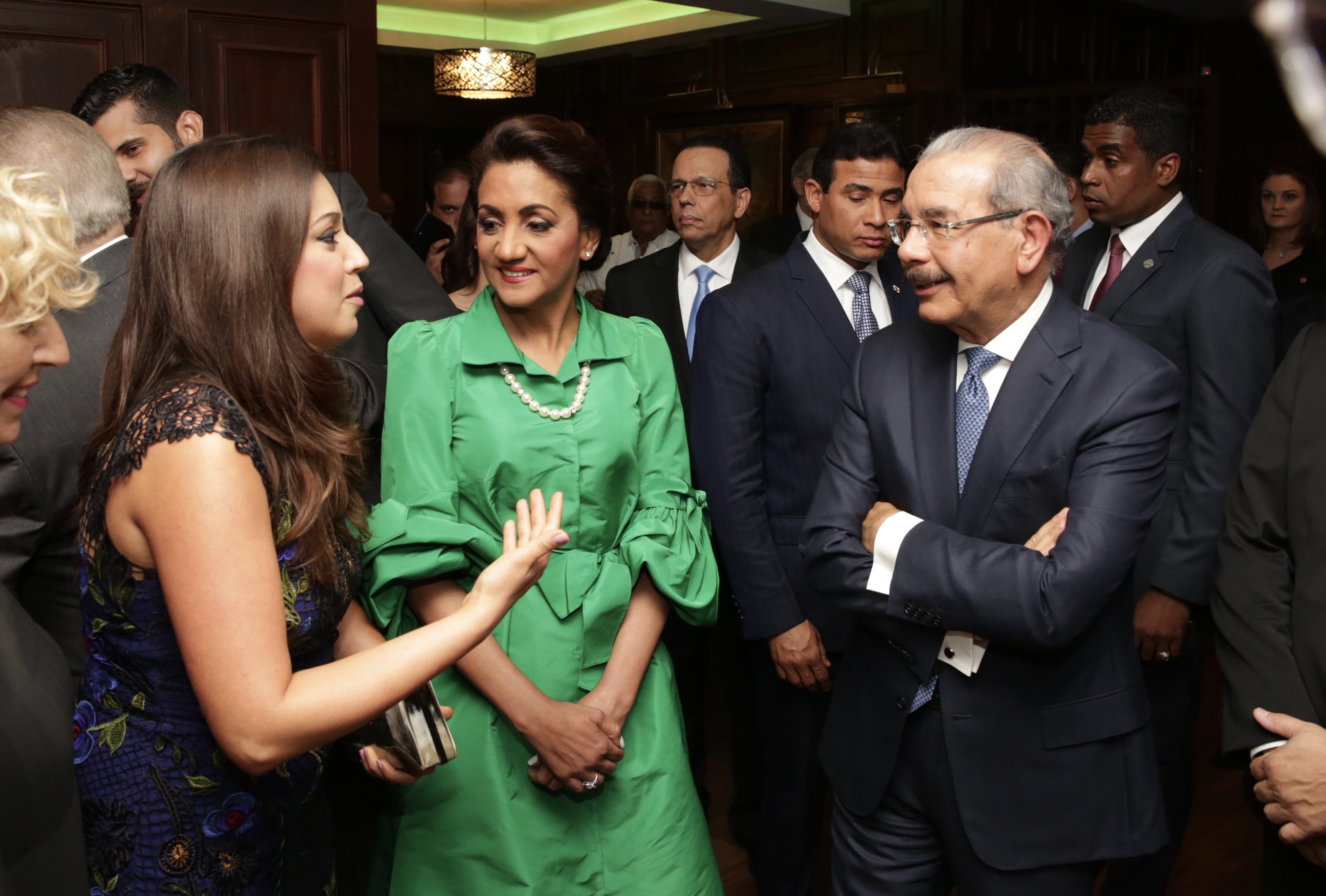 Beatriz Roselló, primera dama de Puerto Rico, la primera dama dominicana Candida Montilla de Medina y el presidente de la República Danilo Medina, mientras conversan previo al inicio de la ceremonia, en el Teatro Nacional Eduardo Brito.