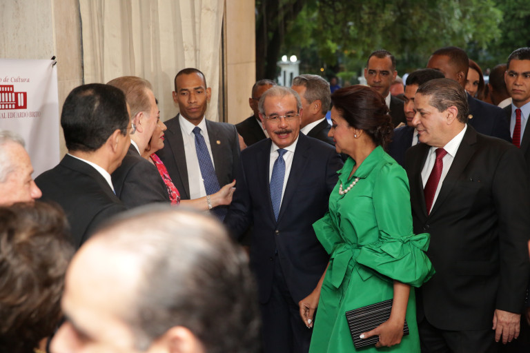 El presidente Danilo Medina y su esposa Cándida Montilla de Medina, a su llegada al acto de apertura de la FILSD 2019, en el Teatro Nacional Eduardo Brito.