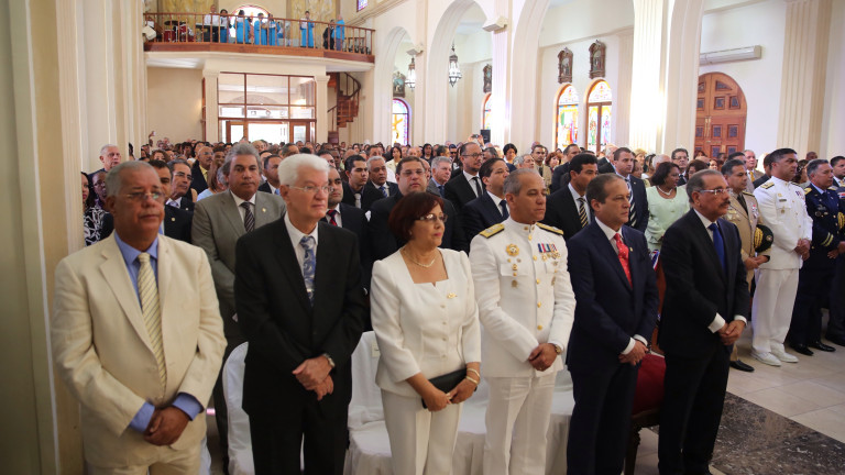 Vista del público asistente a la misa conmemorativa por la fundación de Baní, que fue encabezada por el presidente Danilo Medina y las principales autoridades locales, entre los que se destacan a la izquierda, el alcalde de Baní, Nelson Camilo Landestoy, seguido del senador de la provincia, señor Wilton Guerrero entre otros.